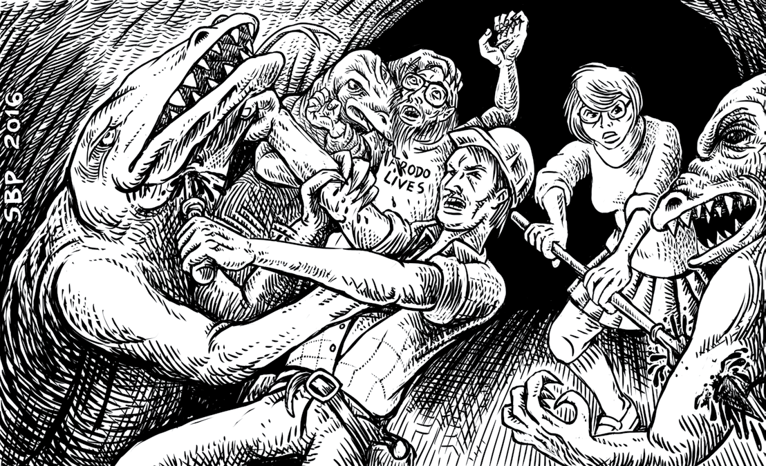 Then it’s time to face off with the wizard and a bunch of lizard men – we get cool powers but die like flies. Erin my middle school student pretty much solos the wizard while everyone else is distracted, but finally gets murdered and the wizard disappears. Darryl manages to kill dragon with his .357 Magnum and then the eight survivors from the original group of 20 cross-time weirdos get swept up by magical birds and end up in… Our normal DCC campaign, next time!