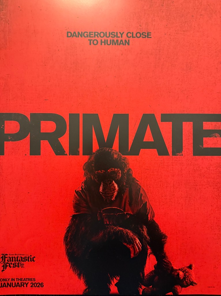 Primate – A young version of Florence Pugh (Johnny Sequoyah) comes home to Hawaii for college break with her girlfriends.  The family chimp gets rabies. Hilarity ensues, and by hilarity I mean faces getting ripped off. Nearly zero foreplay, they just get right to it. Interesting quirk in that the professor dad is deaf (the actor too) and so you get some chilling “can’t hear what is happening right around him” moments, though he’s not there for most of the film. Disappointing in that the monkey just goes to 100% murderchimp immediately, no slack for his family (you’d expect just a little bit of “maybe he won’t kill her!”, but the girl is immediately like “nope he’s gone”). Decent, but watch some murder chimp documentaries first to get in the mood. Coming to theaters in January. 3/5 stars, though I am rounding up to get there.