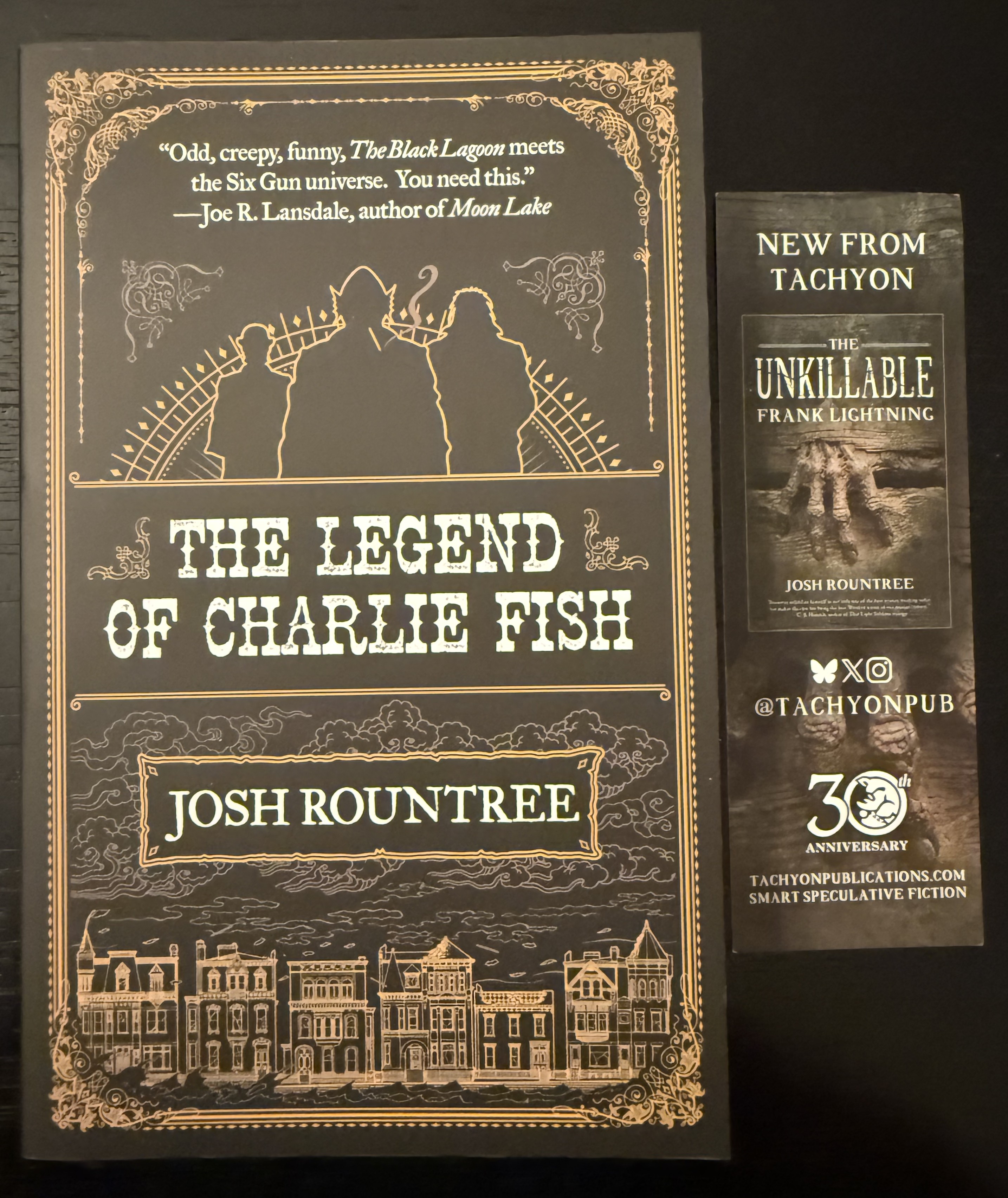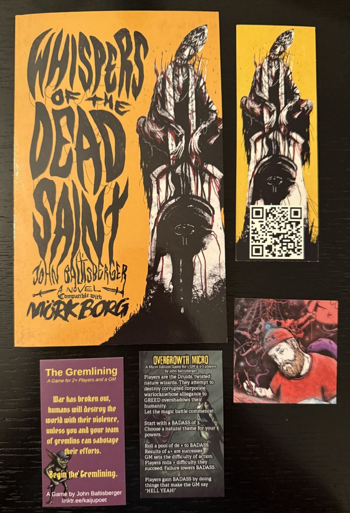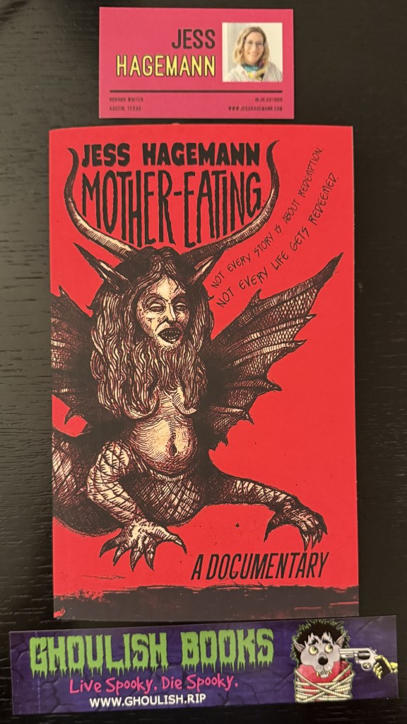 Before the first film of the day, I quickly went to the spooky book sale or whatever they called it, focusing on Texas horror authors, where I picked up three – “The Legend of Charlie Fish” by Josh Rountree (Tachyon Publishing), a horror novel set in Galveston during the hurricane, “Whispers of the Dead Saint” by John Bathlisberger (Madness Heart Press), fiction for Mork Borg the new style RPG, and “Mother-Eating” by Jess Hagemann (Ghoulish Books), a retelling of Marie Antoinette’s reign set in Austin. And I got all three signed by the author!