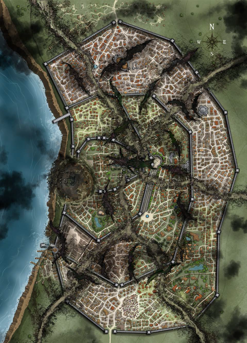 We take out Southbank first and then try to capture the bridge, but unlucky rolling lets them destroy it before we can secure it. So we clear out the cemetery and Paradise Hill (apparently even crusader citadels have low income housing projects) while we rebuild.  We stretch the mass combat rules to their breaking point with our cunning tactics.