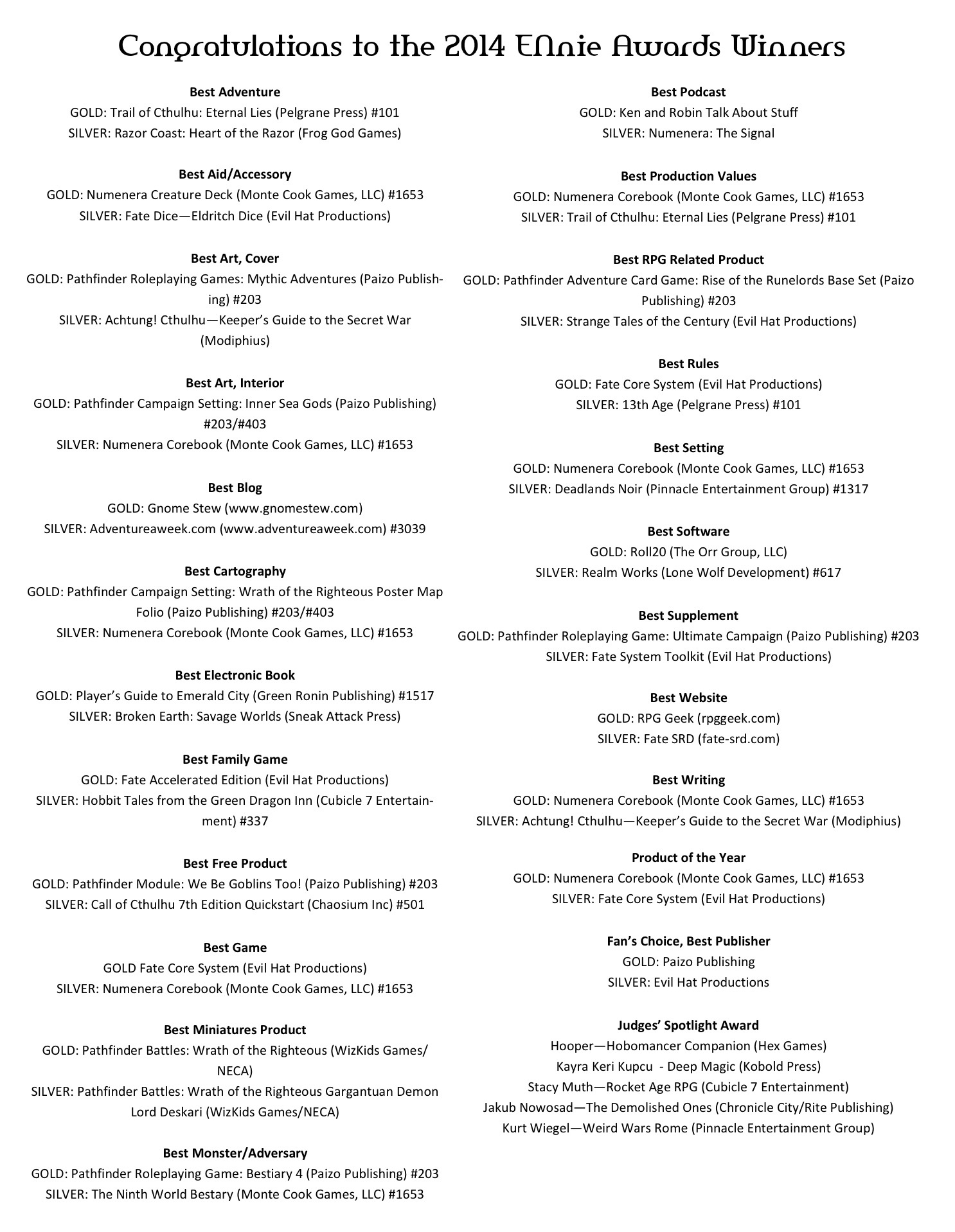 I picked Numenera for Best Production Values and Numenera as second for Setting (along with Razor Coast, which should have gotten more than one ENnie). Best Supplement – Ultimate Campaign, and I tagged Realm Works and roll20 for Best Software and FATE/Numenera for Product Of The Year. Of course Paizo gets fan favorite, that goes without saying.